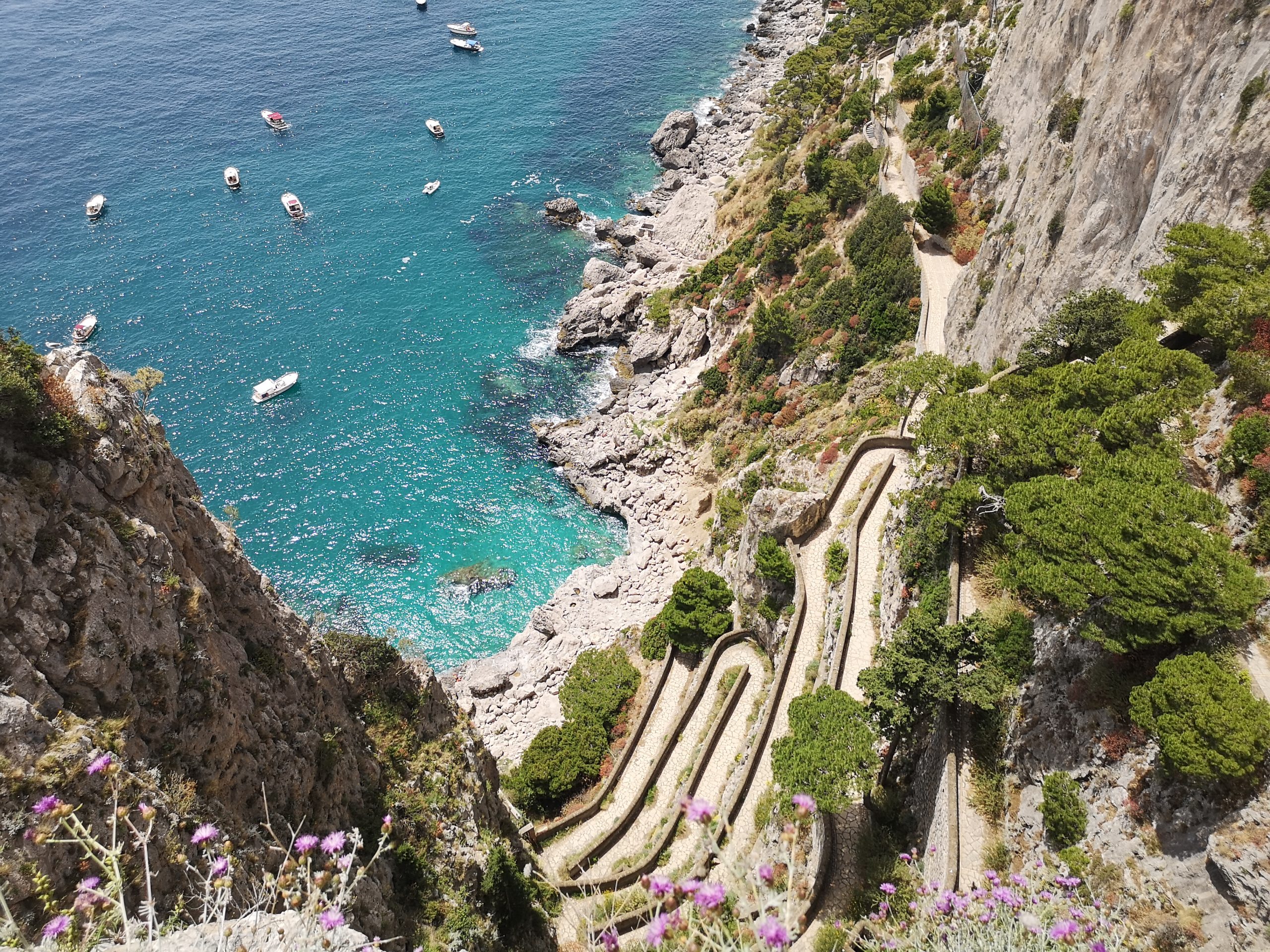 A következő állomás az Augustus kertjei volt. Már az oda vezető út is nagyon hangulatos, szűk, kanyargós utcákon bolyongva jutottunk el a kerthez. Maga a kert pedig egy kis árnyas oázis a perzselő napsütésben, rengeteg virággal és fával. És ami a kert legnagyobb látványossága szerintem, az itt is a kilátás Caprira, a Faraglioni-sziklákra, a Via Kruppra és a Marina Piccola öbölre.