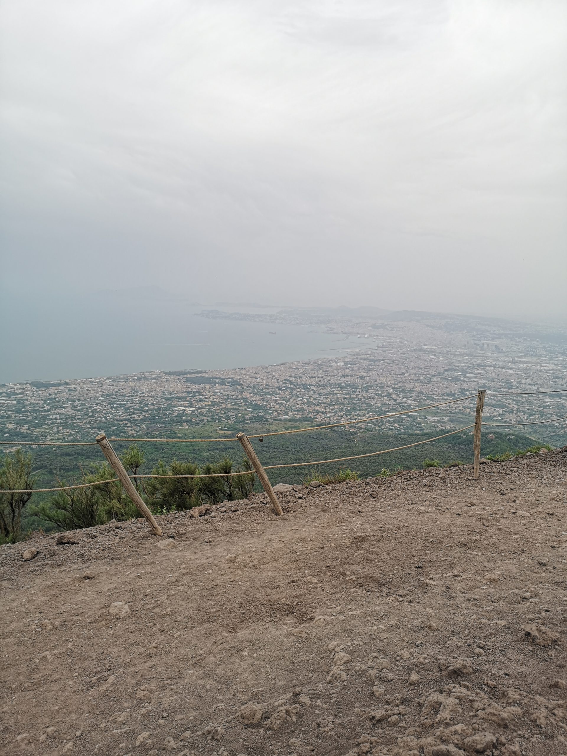 Felérve a kürtő szélére elénk tárul az egész Nápolyi-öböl Nápolytól egészen Capriig. A kürtő peremén elég hosszan lehet sétálni, több irányból is benézhetünk a pihenő vulkán szájába. Régebbi fotókon láttam, hogy anno vezetett le egy kis szerpentin a kürtőbe is, ez ma már sajnos nincs, meg kell elégednünk a peremmel.